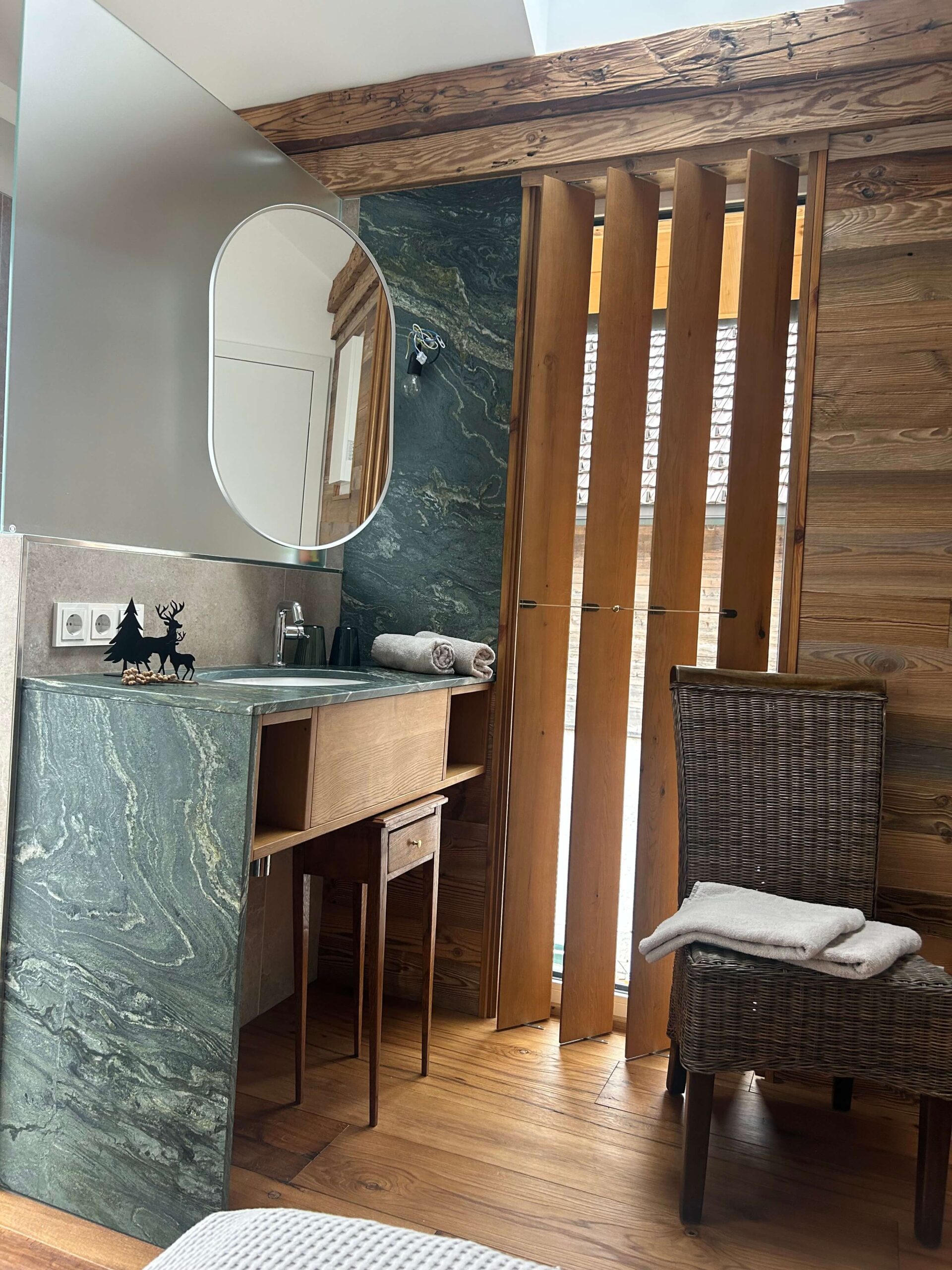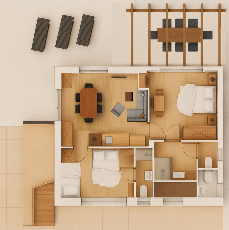 - Zwei stilvolle Doppelzimmer mit eigenen Badezimmern, eines davon mit zusätzlichem Hochbett